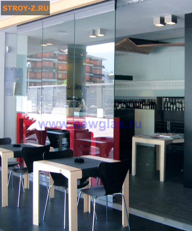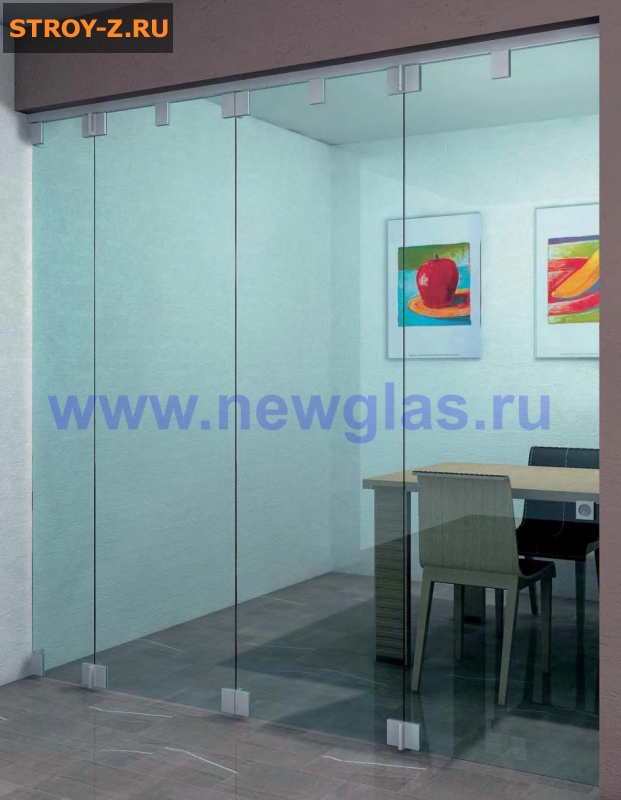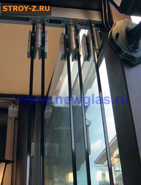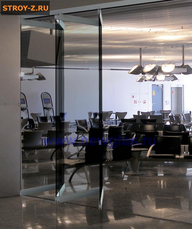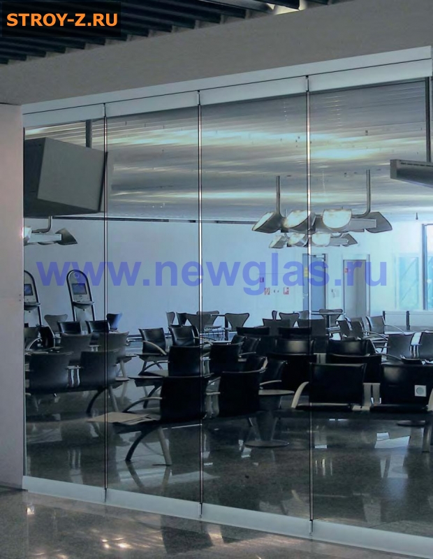 стеклянные раздвижные перегородки NewGlasСтеклянная раздвижная перегородка NewGlas гармошка RPG QB 3611: имеет верхнею и нижнею направляющую, а стеклянные панели NewGlas соединены петлями, благодаря которым панели собираются вместе.